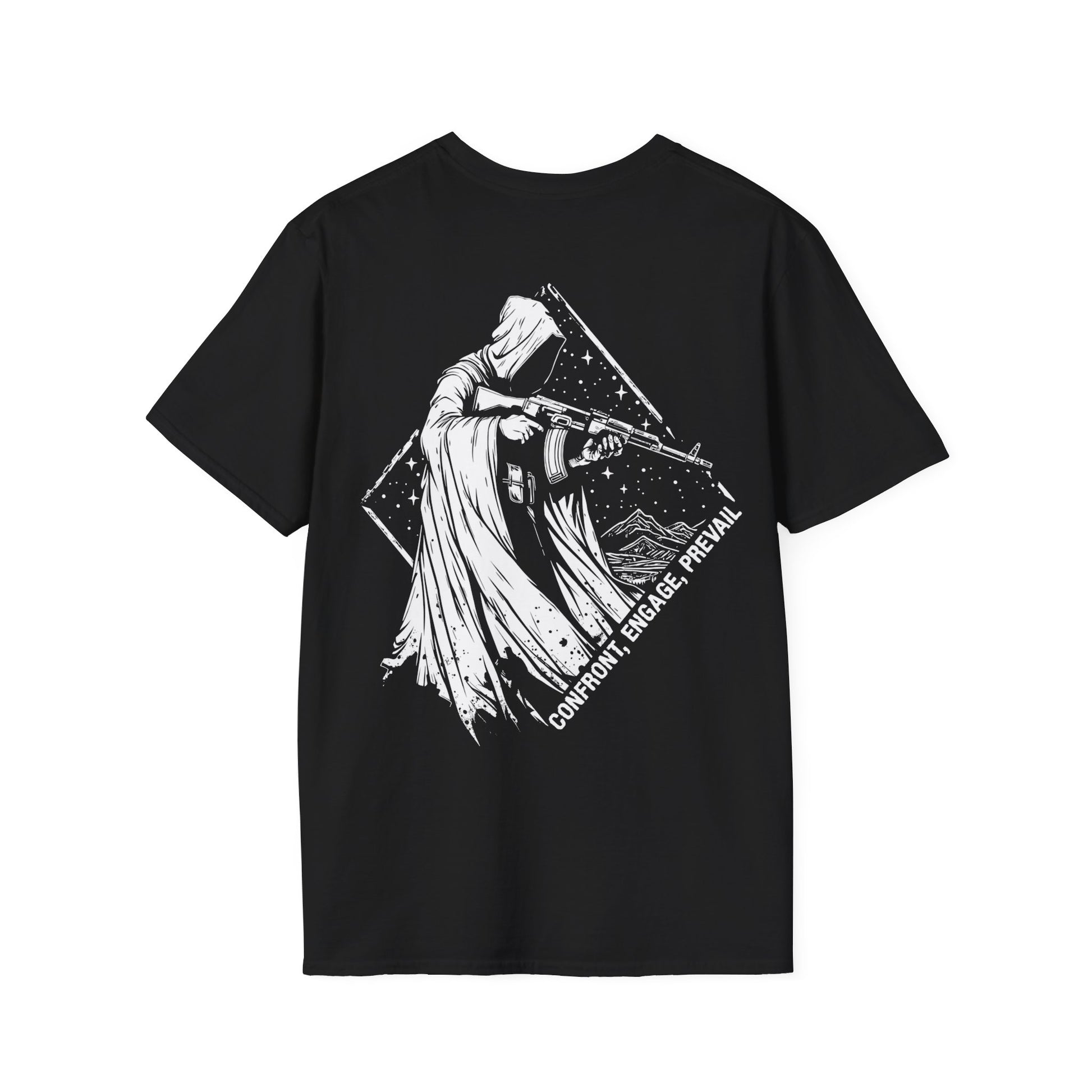 Right across the front, we've got the bold, incredible words: "Confront, Engage, Prevail". That's right, folks, this shirt is all about winning. Confront the challenges, engage with strength, & prevail like a champion.