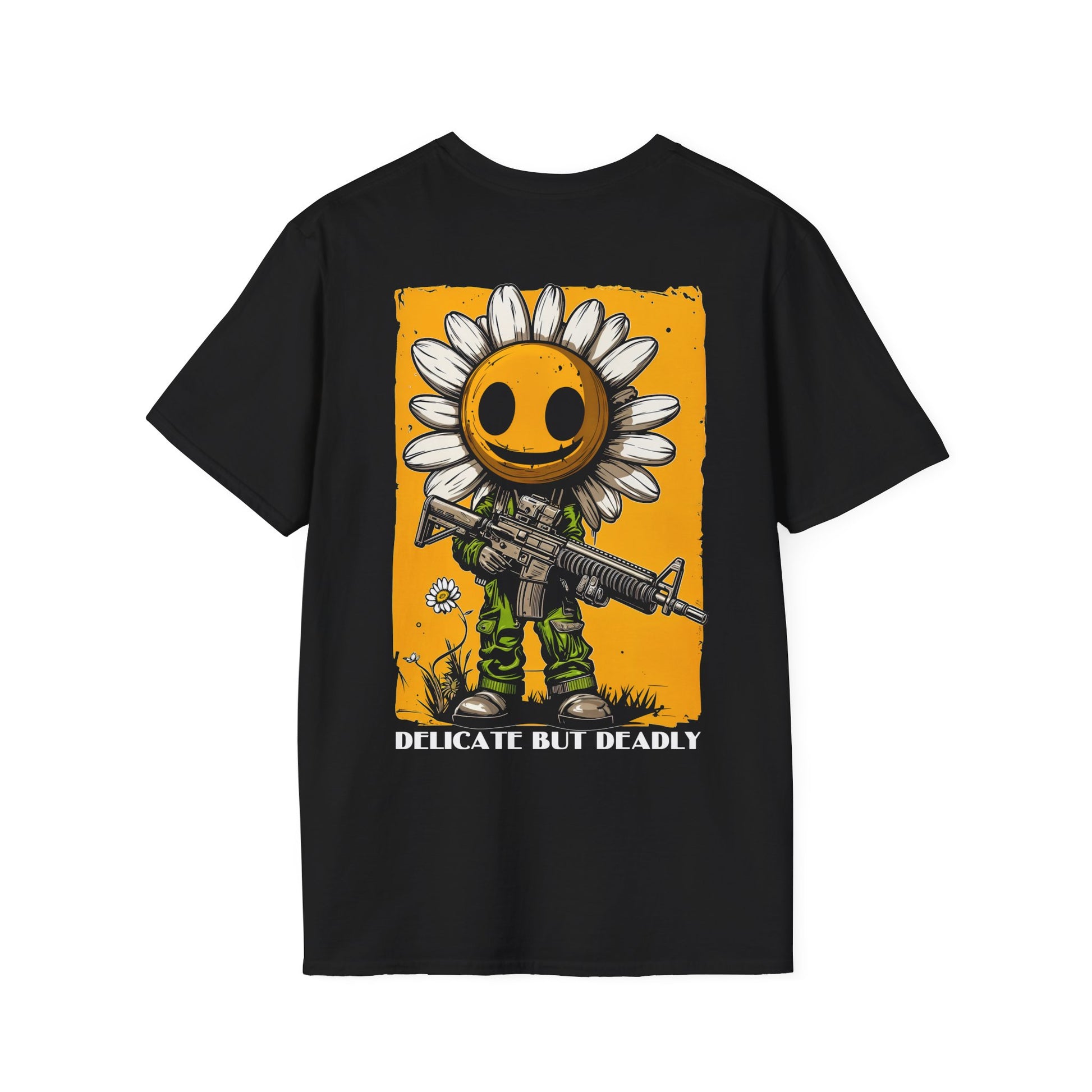 The "Delicate but Deadly" t-shirt is for the black sheep of the flower patch! This daisy’s got a smile creepier than a haunted greenhouse and a rifle ready to prune more than just weeds. With a smile that’s equal parts sunny and sinister, it’s the perfect fit for anyone who’s pretty on the outside but a total menace within. Rock this shirt to show the world you’re a walking contradiction: sweet enough to charm, deadly enough to harm!
