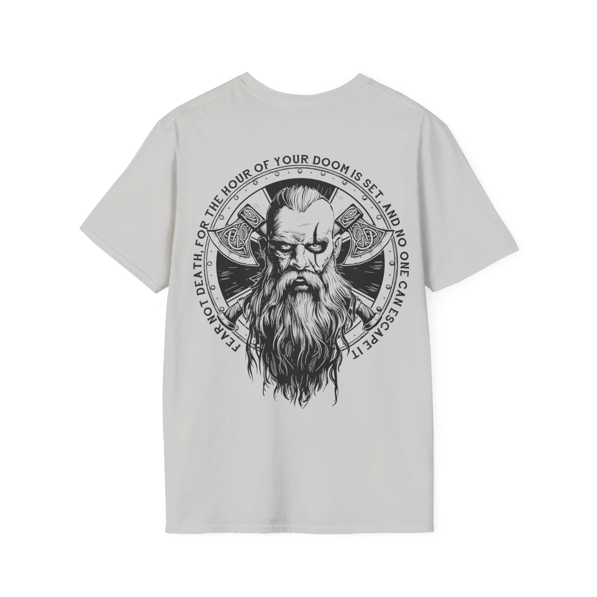 Unleash your inner warrior with our "Fear Not" T-shirt, a bold statement of resilience and courage. This striking design features a fierce Viking face set against a powerful shield, with two crossed axes symbolizing strength and readiness for any challenge. The caption "Fear not, for the hour of your doom is set, and no one can escape it" serves as a reminder that while fate may be inevitable, facing it with bravery and determination is what defines a true warrior. Wear this T-shirt to inspire confidence and embody the fearless spirit of the Vikings, ready to conquer whatever comes your way.