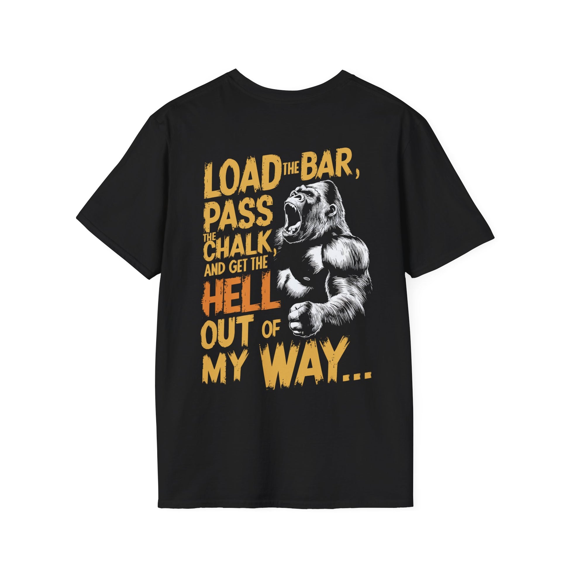 Get pumped with this empowering shirt designed for dedicated lifters. The back boldly says, "Load the Bar, Pass the Chalk, and Get the Hell Out of My Way" to show you mean business at the gym. The new anvil logo is a symbol of hard work and determination. Whether you're lifting weights, setting new records, or pushing through tough sets, this shirt is a symbol of your commitment to progress. It's not just clothing; it's a statement of strength and resilience. Wear this tee proudly as you dominate the gym and leave nothing but sweat and determination behind!