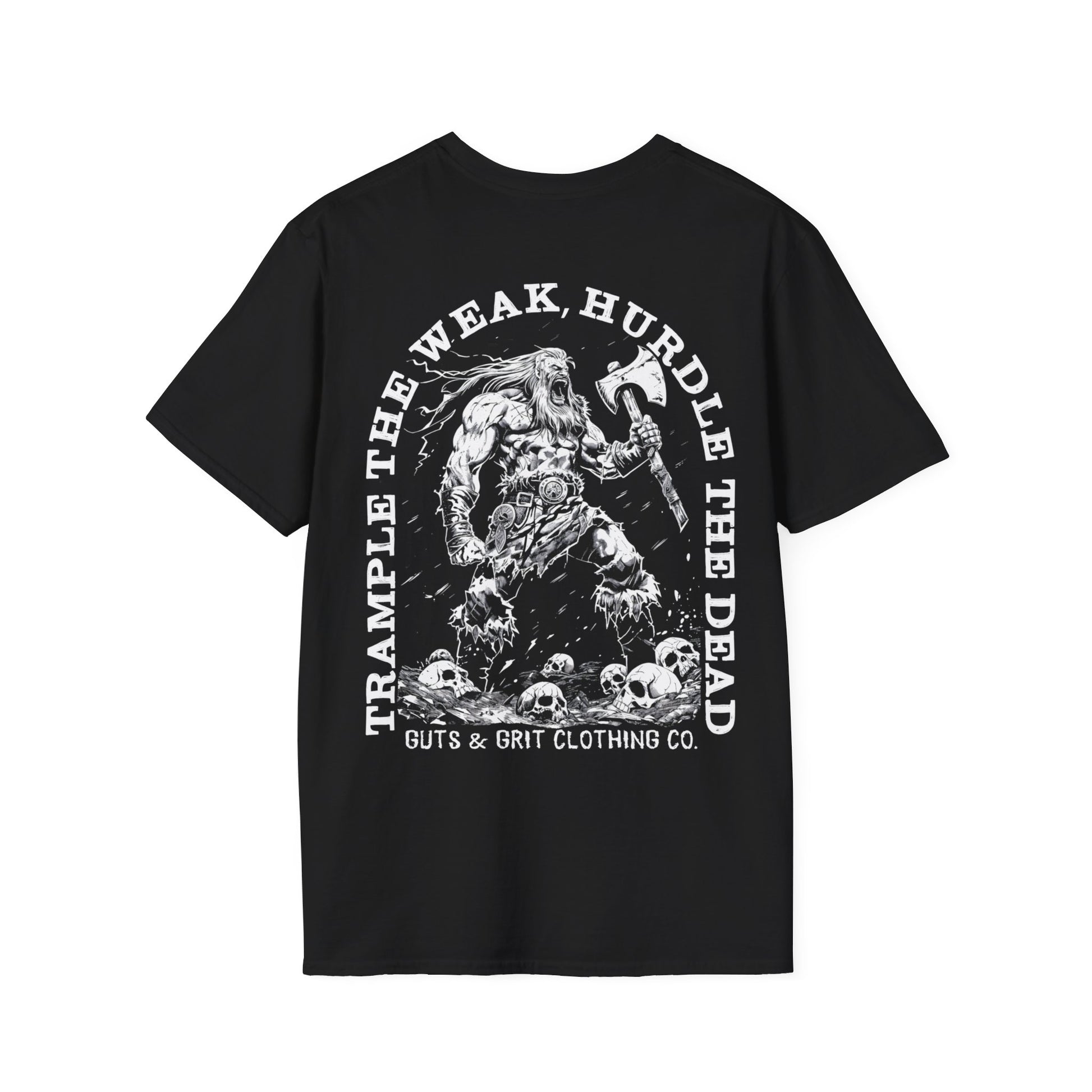 Unleash your inner warrior with our bold & fierce "Trample The Weak, Hurdle The Dead" t-shirt. Featuring a striking design of a muscular Viking wielding a massive axe, this shirt showcases him confidently striding over a field of human skulls. Perfect for those who embrace strength & resilience, this tee is a powerful statement piece. Embrace your power & let the world know you mean business with this unforgettable design.